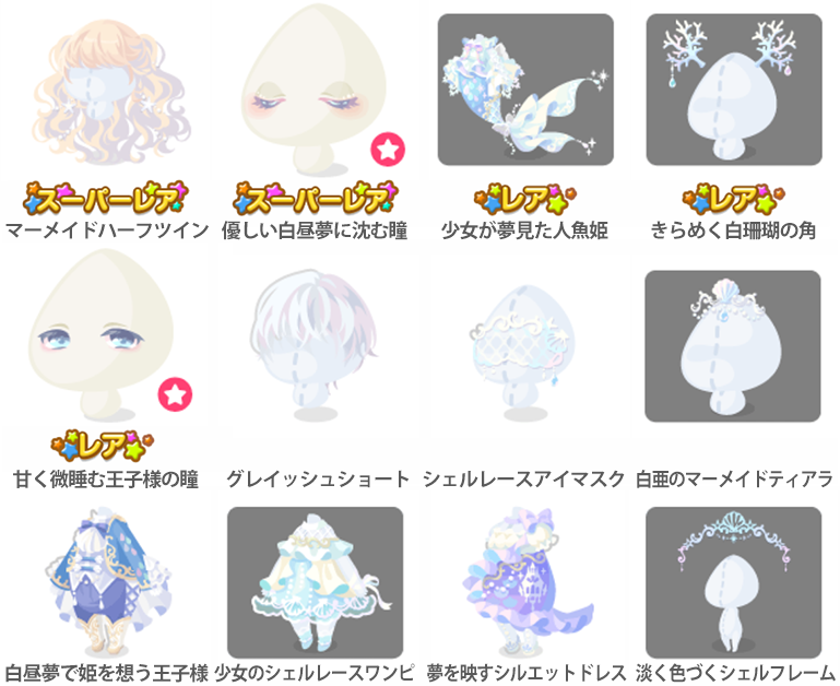 ★マーメイドハーフツイン ★優しい白昼夢に沈む瞳(顔パーツ) ☆少女が夢見た人魚姫(アクション付きfアイテム) ☆きらめく白珊瑚の角 ☆甘く微睡む王子様の瞳(顔パーツ) グレイッシュショート シェルレースアイマスク 白亜のマーメイドティアラ 白昼夢で姫を想う王子様 少女のシェルレースワンピ 夢を映すシルエットドレス 淡く色づくシェルフレーム
