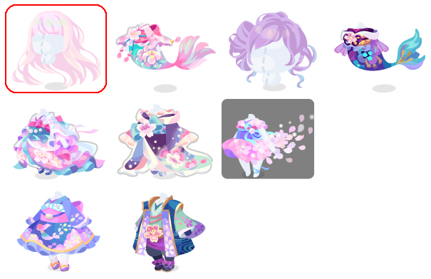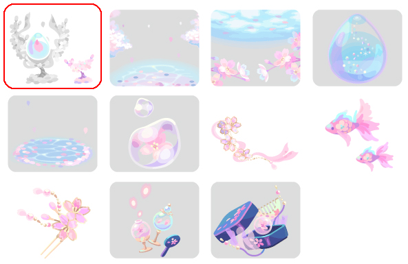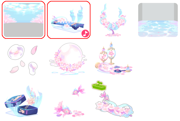 ★人魚姫の桜恋歌の壁 ★恋音奏でる人魚姫の琴(ネイロアイテム) ☆恋を歌う人魚姫の水桜 ☆人魚姫の桜恋歌の床 ☆たゆたう泡桜 想いと共に眠る泡桜ベッド 人魚姫の恋まじない風呂 文箱と桜かんざしのトイレ 花弁と遊ぶはなおとと 一枝の水桜プランター