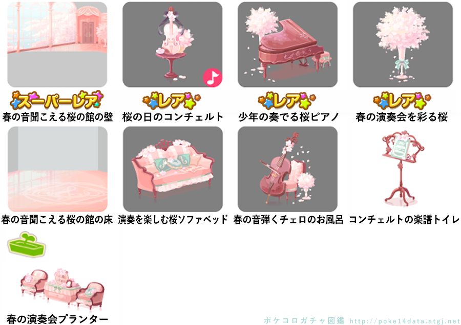 ★春の音聞こえる桜の館の壁 ☆桜の日のコンチェルト(ネイロアイテム) ☆少年の奏でる桜ピアノ ☆春の演奏会を彩る桜 春の音聞こえる桜の館の床 演奏を楽しむ桜ソファベッド 春の音弾くチェロのお風呂 コンチェルトの楽譜トイレ 春の演奏会プランター