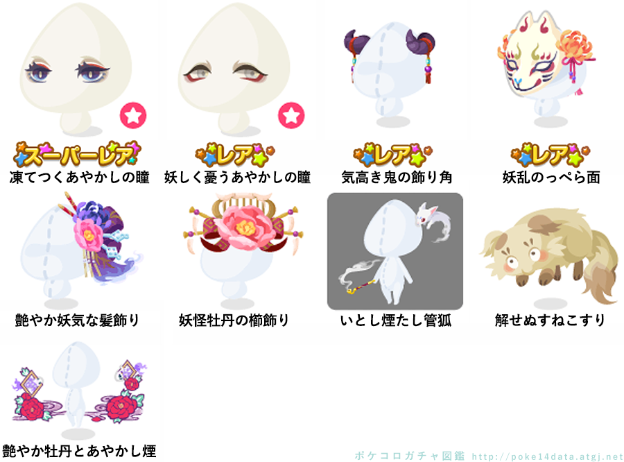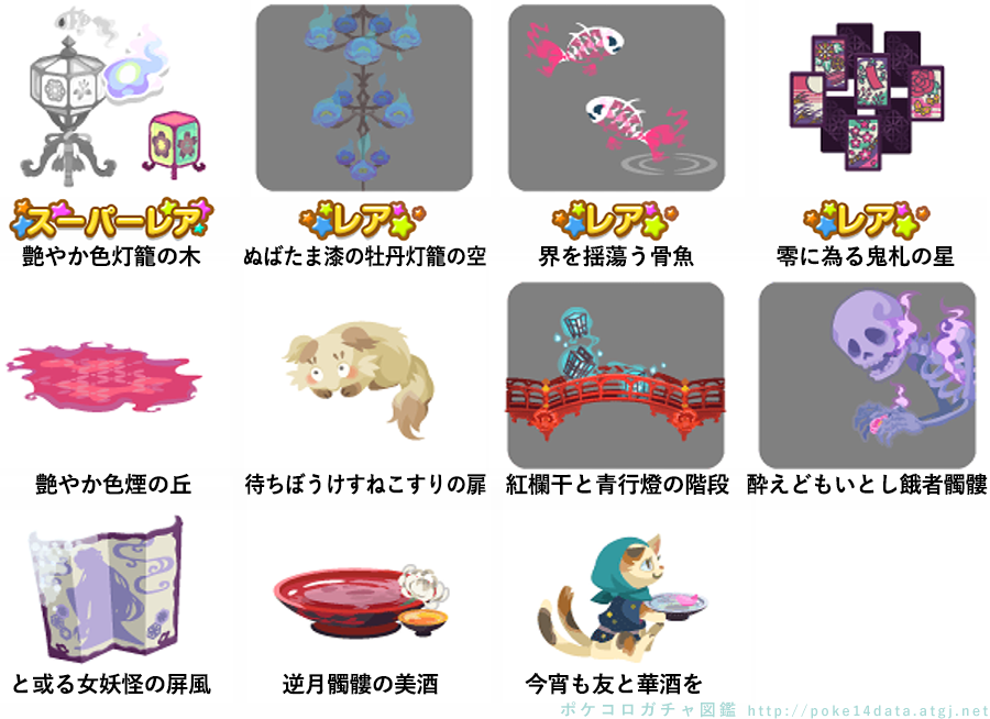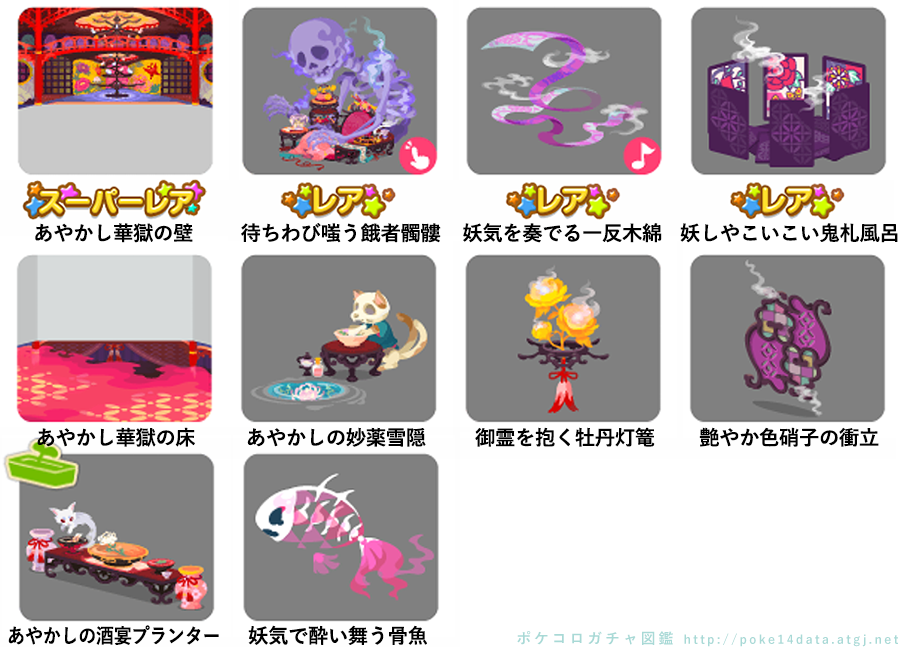 ★あやかし華獄の壁 ☆待ちわび嗤う餓者髑髏(アクションアイテム) ☆妖気を奏でる一反木綿(ネイロアイテム) ☆妖しやこいこい鬼札風呂 あやかし華獄の床 あやかしの妙薬雪隠 御霊を抱く牡丹灯篭 艶やか色硝子の衝立 あやかしの酒宴プランター 妖気で酔い舞う骨魚