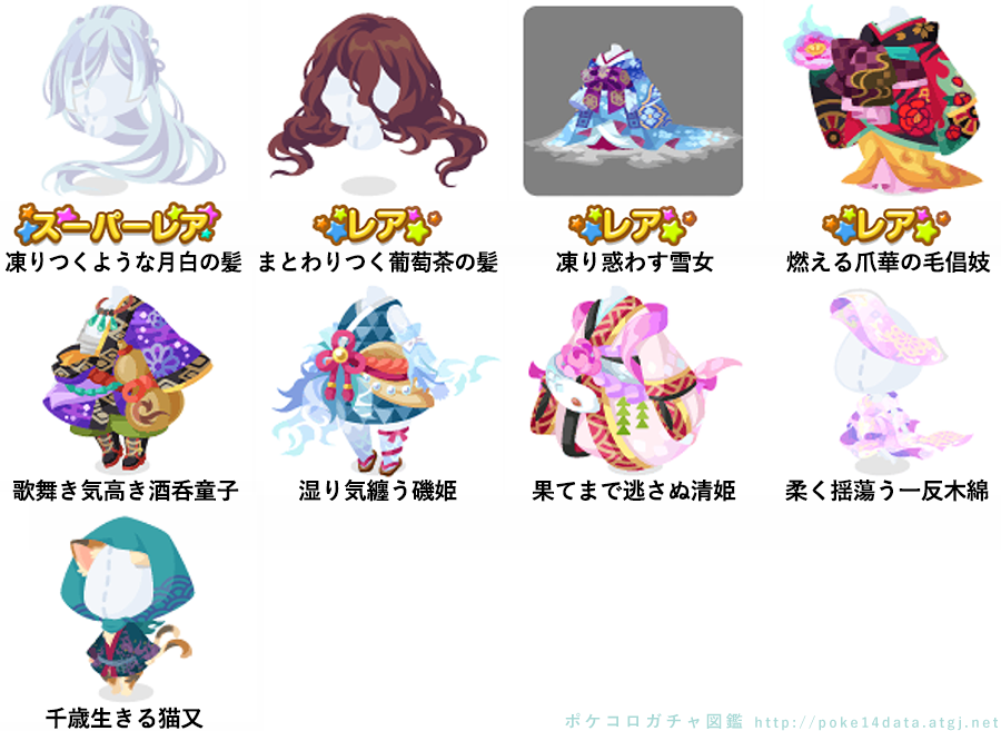 ★凍りつくような月白の髪 ☆まとわりつく葡萄茶の髪 ☆凍り惑わす雪女 ☆燃える爪華の毛倡妓 歌舞き気高き酒呑童子 湿り気纏う磯姫 果てまで逃さぬ清姫 柔く揺蕩う一反木綿 千歳生きる猫又