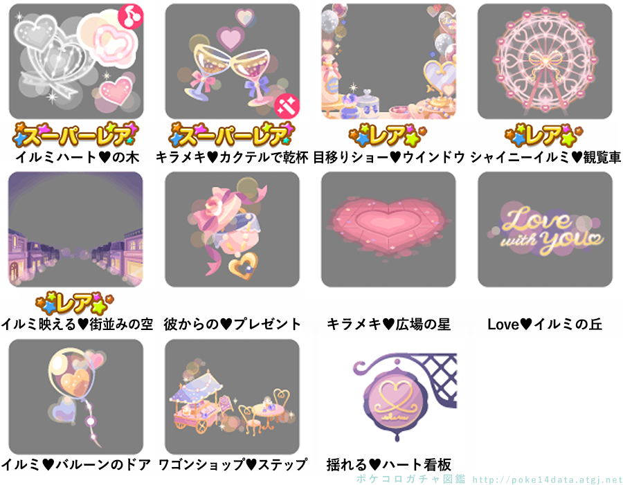 ★イルミ♥デートの壁 ☆Love me♥スポット(ネイロアイテム) ☆イルミハート♥フレーム ☆メリーゴーランド♥バス イルミデート♥の床 ワゴンショップ♥ベッド テラスでのひと時♥トイレ ハートフル♥イルミアーチ 彼待ち♥ベンチプランター