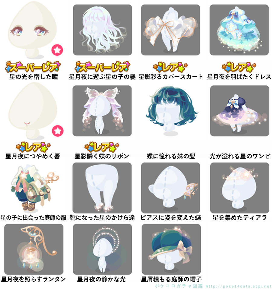 ★星の光を宿した瞳(顔パーツ) ★星月夜に遊ぶ星の子の髪 ☆星影彩るカバースカート ☆星月夜を羽ばたくドレス(アクション付きfアイテム) ☆星月夜につやめく唇(顔パーツ) ☆星影瞬く蝶のリボン 蝶に憧れる妹の髪 光が溢れる星のワンピ 星の子に出会った庭師の服 靴になった星のかけら達 ピアスに姿を変えた蝶 星を集めたティアラ 星月夜を照らすランタン 星月夜の静かな光 星屑積もる庭師の帽子