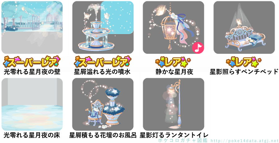 ★光零れる星月夜の壁 ★星屑溢れる光の噴水 ☆静かな星月夜(ネイロアイテム) ☆星影照らすベンチベッド 光零れる星月夜の床 星屑積もる花壇のお風呂 星影灯るランタントイレ